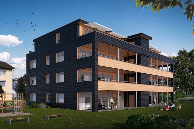Dies ist das erste Mehrfamilienhaus mit vier Wohngeschossen, welches komplett in Holz erstellt wurde. Nur die Erschliessungszone mit Treppen und dem Lift mussten aus baupolizeilichen Gründen in Beton ausgeführt werden. Die Geschossdecken wurden mit ab Werk überbetonierten Optiholz Betonverbundelementen realisiert.