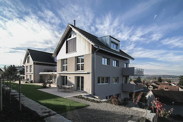 Auf der Südseite erreichte man dank der Fortsetzung der bestehenden, formwilden Bollensteinmauer eine 330 m2 Grünfläche, die gemeinsam genutzt werden kann. Darunter befinden sich auch ein Grillplatz und ein Garten. Jede Partei behält dabei ihren eigenen Sitzplatz. Im Innern ermöglichen im Erdgeschoss die zur Küche offenen Wohnräume eine moderne Grundrissaufteilung, welche sich jedoch auf individuellen Wunsch der Bauherrschaften deutlich unterscheiden. Trotzdem wurde darauf geachtet, dass das äussere Gesamtbild harmonisch und einheitlich bleibt. Im Dachgeschoss ermöglichen die mit Chromstahl-Blech eingekleideten Schleppgauben eine maximale Ausbaustufe mit jeweils zwei Zimmern inkl. vollwertigen Nasszellen.
