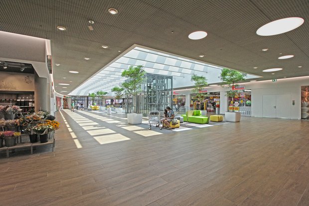 Um die Mall im Erdgeschoss offener zu gestalten wurde ein Glasoblicht mit den beeindruckenden Dimensionen von 38 x 11 m eingebaut. Dieses durchflutet am Tag die Mall mit direktem Sonnenlicht und ist am Abend mit einer effektvollen LED-Beleuchtung inszeniert. Die neue Mall bildet das zentrale Element des Einkaufszentrums und beheimatet die zentrale Erschliessung aus der freundlich gestalteten Tiefgarage. Der Zugang erfolgt über zwei Rollbänder und einer in einem Glasschacht geführten Duplexliftanlage.