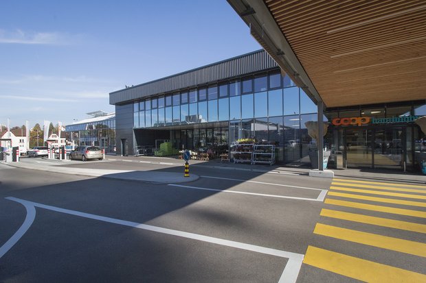 Nach Norden wurde das Gartencenter realisiert das wie ein Treibhaus aus einer verzinkten Stahlkonstruktion mit Teilverglasung im Dach ausgeführt ist. Auf dem Dach wird für die CO2 - Optimierung eine aufgeständerte Photovoltaik - Anlage montiert. Nach der Fertigstellung wird der Bau nun als Provisorium für die nachfolgende Umnutzung des bestehenden Coop Rhymarkt genutzt. Diese zweite, grosse Bauetappe startet im Früjahr 2017.