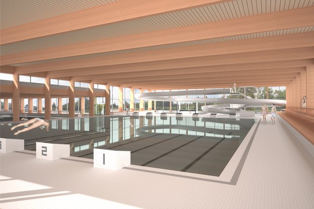 Der Vorschlag von M+P sah vor, das Bestandsvolumen fast vollständig zurückzubauen. Die neu erstellten Bauten des Hallenbades gliedern sich in zwei Hauptkörper, von welchen der Grössere als klar ablesbare Form dem restlichen Bauvolumen um 90 Grad gedreht aufgesetzt wird. Dies wird akzentuiert mittels einer Überschiebung gegen Norden und Osten, was der prominenten Ankunftssituation von der Schlossmühlestrasse her ein ikonisches Gesicht gibt. Der präzis platzierte Baukörper setzt einen städtebaulichen Akzent und bildet ein Gegenüber zu dem markanten Schlossparkgebäude im Norden. Als klare Trennung zwischen den Zonen gibt es einen Höhenversatz, welcher die Überhöhung des Hauptkörpers klar unterstreicht.