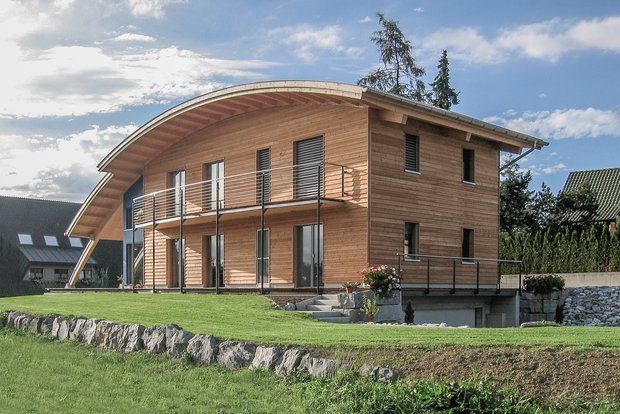 Mit 22 m Radius und grossem Vordach überspannt das Bogendach das ganze Wohnhaus mit dem riesigem Sitzplatz auf der Südwestseite und gibt dem Gebäude in Holzbauweise die aussergewöhnliche Form.