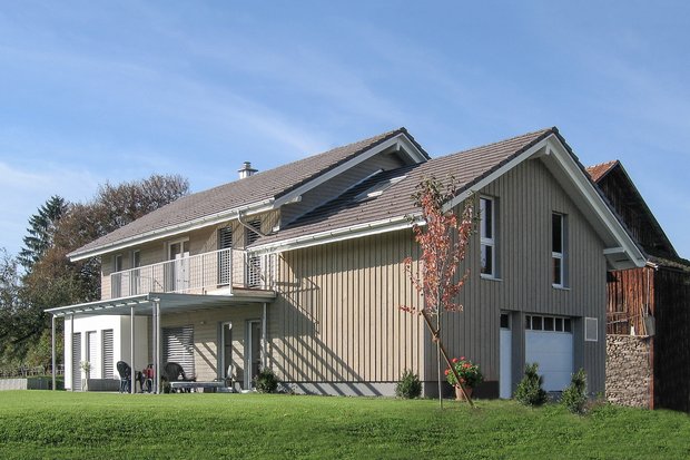 Das ländliche und doch moderne Einfamilienhaus liegt erhöht auf einer Geländeterrasse. Das Gebäude wurde als zweiteiliges Ensemble auf diese Terrasse gesetzt. Zum Einen das durch die horizontale Stülpschalung edlere, massivere Wohnhaus und zum Anderen mit „Scheunencharakter“, die im Dach tiefer gesetzte Garage.